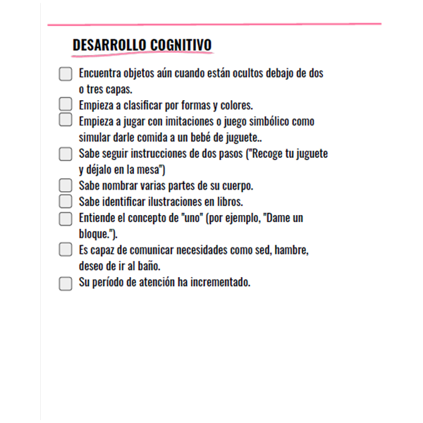 Te dejo una lista de los logros en el desarrollo que deben completar en sus diferentes áreas (cognitivo, socio-emocional, del lenguaje y motor).